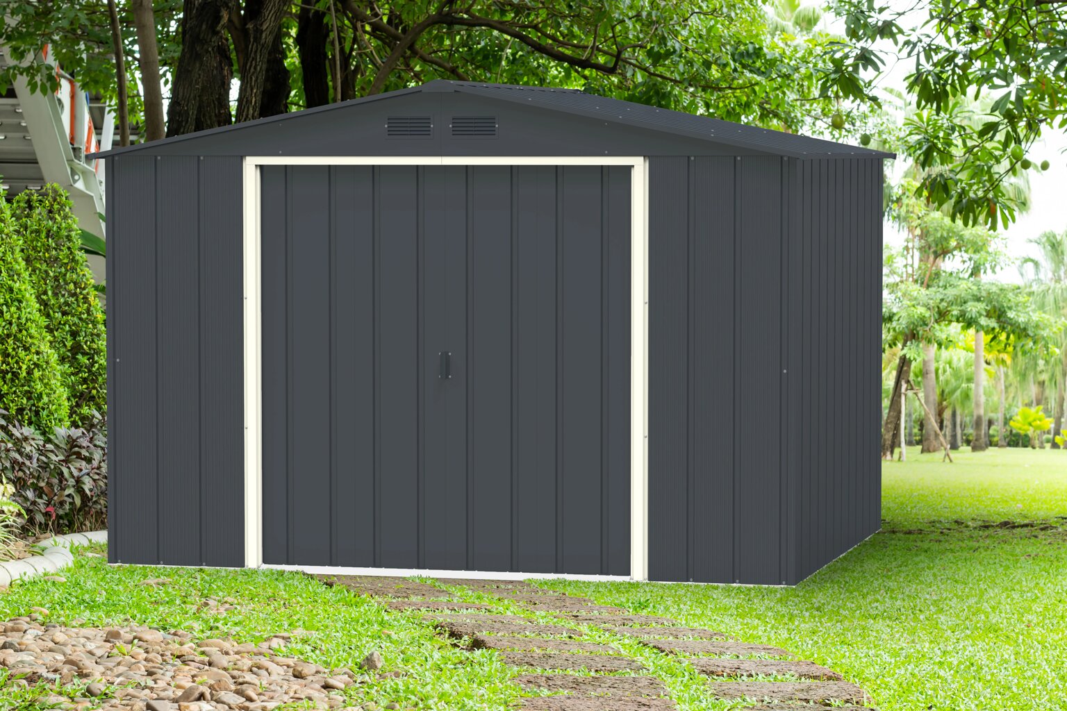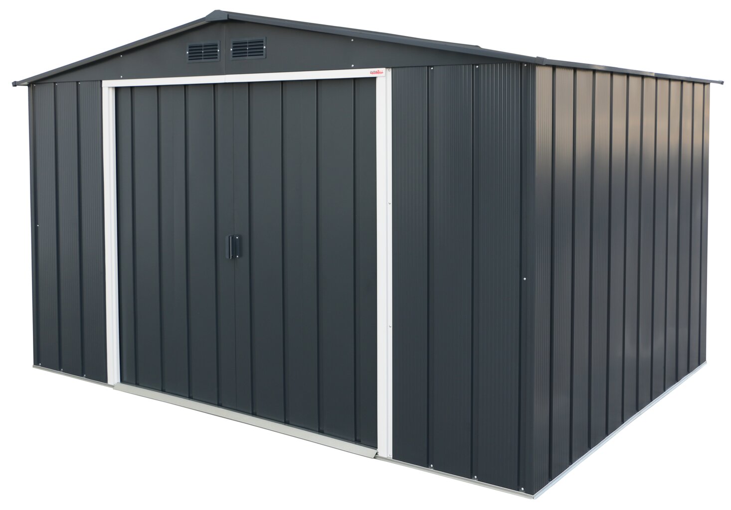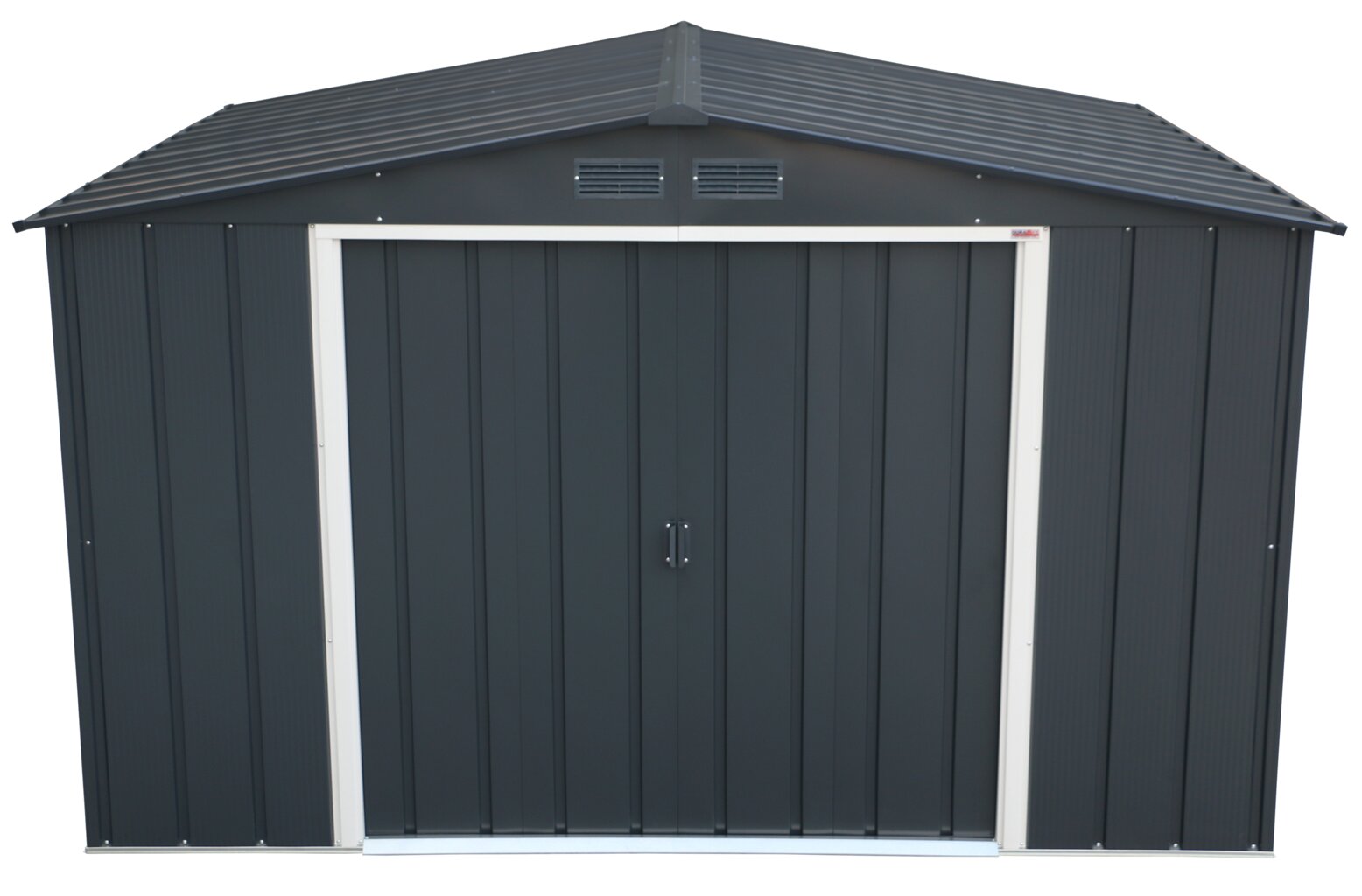 Wartungsfreies Gerätehaus aus pulverbeschichtetem, feuerverzinktem Stahlblech, im modernen Design ausgeführt. Langlebig und wetterfest. Mit zwei großen Schiebetüren und einer hohen Türöffnung für bequemen Zugang.